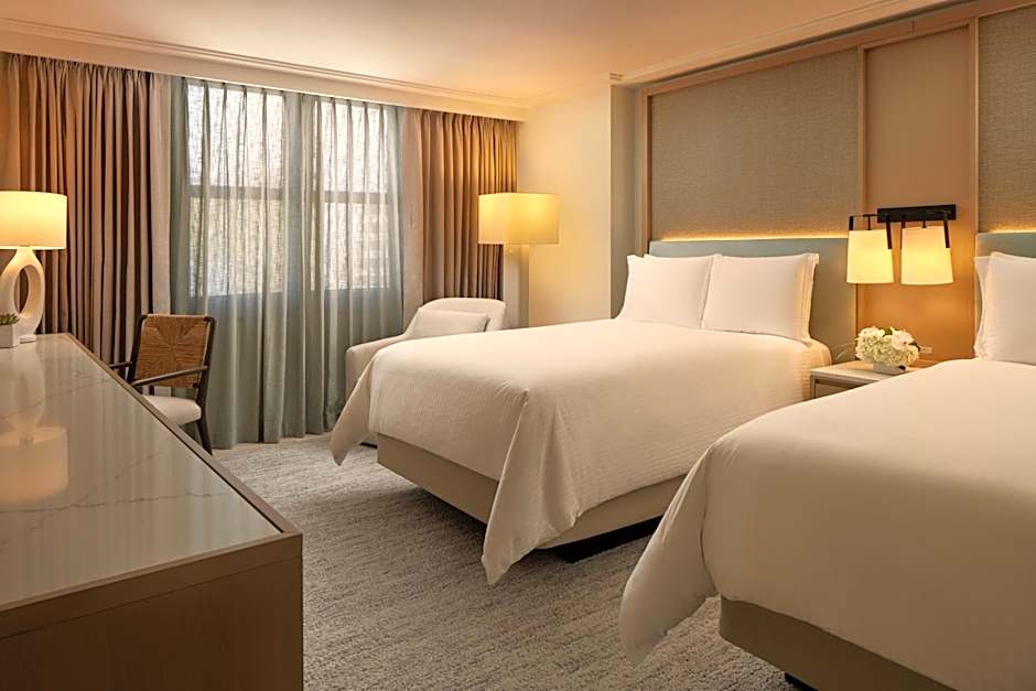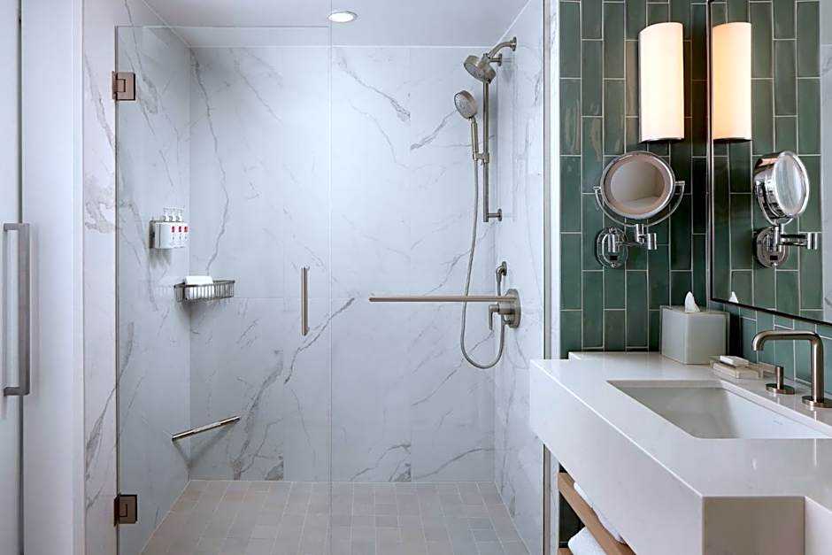 This accessible guestroom includes a city skyline view. A work desk, flat-screen TV and a private, marble bathroom with a walk-in shower.