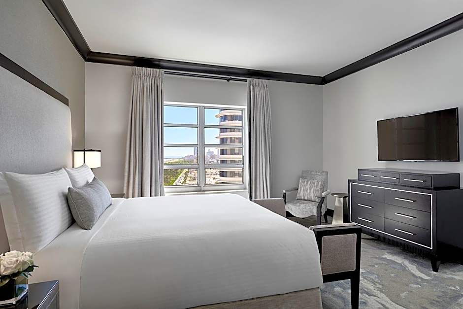 This hearing accessible guestroom includes a city skyline view. A work desk, flat-screen TV and a private, marble bathroom with a walk-in shower.